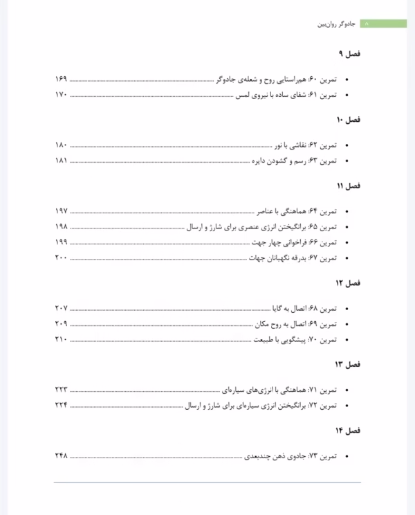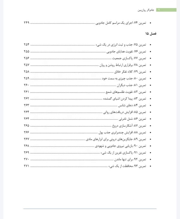- عملی کردن جادو: پس از ایجاد پایههای لازم، کتاب در فصل پایانی مجموعهای از “طلسمهای روانی و ترفندهای جادویی” (فصل ۱۵) را ارائه میدهد که به شما امکان میدهد تمام مهارتهای آموخته شده را در موقعیتهای واقعی به کار بگیرید. این تمرینات شامل مواردی مانند “پیدا کردن اشیاء گمشده” (تمرین ۸۳) یا “برداشتن نفرین از روی یک شیء” (تمرین ۹۱) است که نمونههای عملی از یک جادوگر روانی هستند.